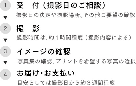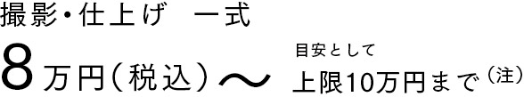 (注)撮影場所への交通費がかさむ場合、また、納品する写真集の部数や写真プリントの枚数が多くなる場合などは、この限りではない場合があります。その場合は事前にご相談させていただきます。